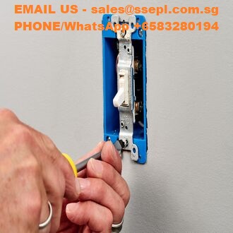 Electrician technician at work blocks the cable between the clamps of a socket in a residential electrical installation